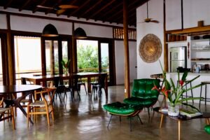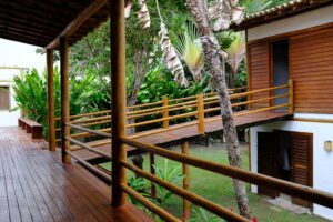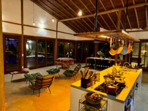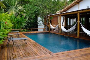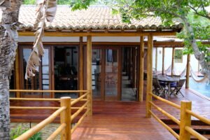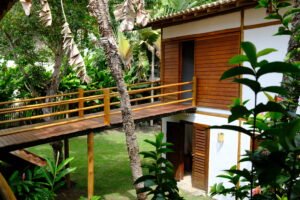 Com projeto desenvolvido por Hélio Pellegrino, a residência combina arquitetura charmosa, integração com a natureza e funcionalidade — características marcantes dos imóveis de alto padrão no litoral sul da Bahia.