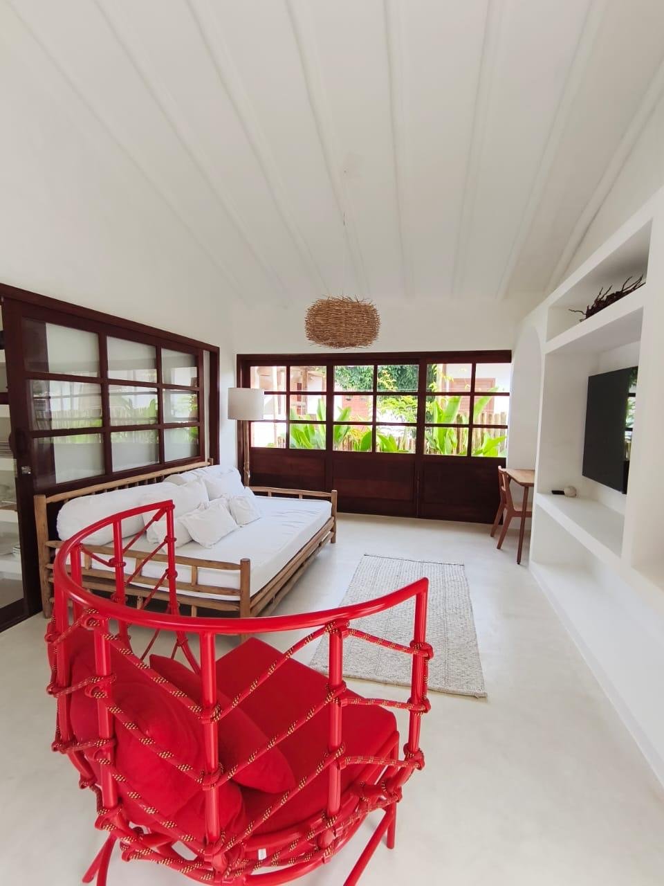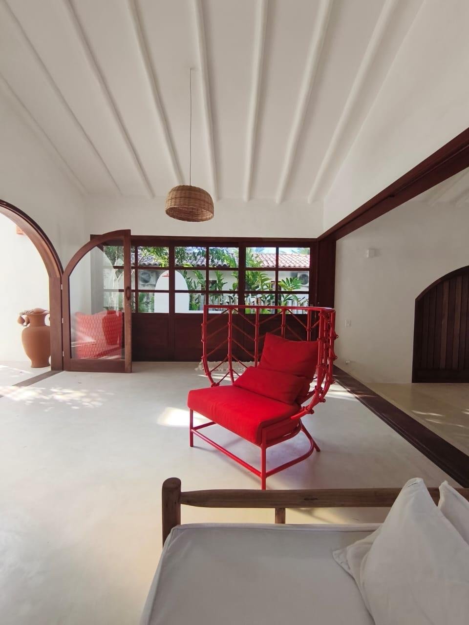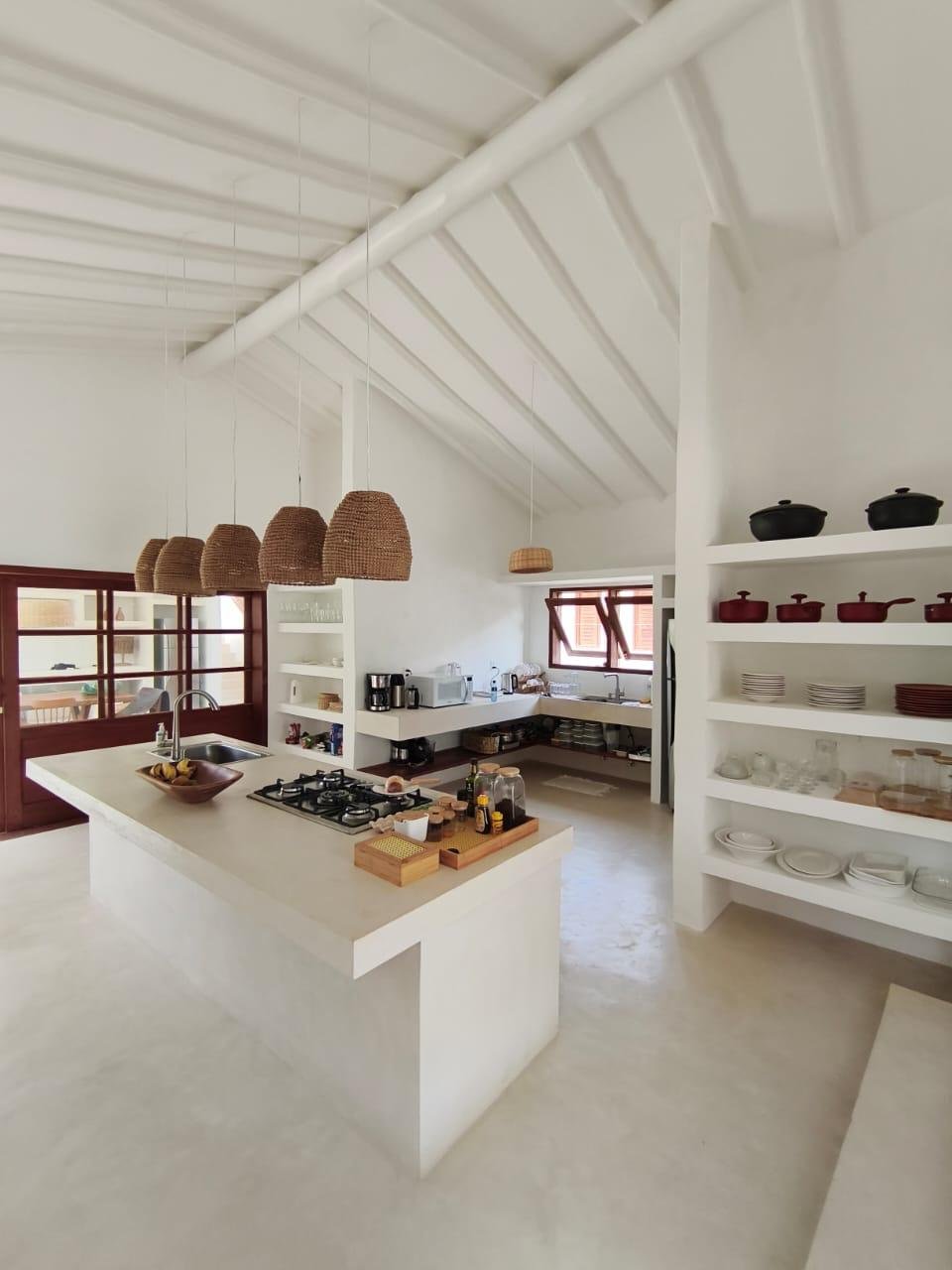 A integração entre sala e cozinha cria um ambiente acolhedor e ideal para receber amigos e família. A área externa com piscina complementa a experiência de casa de praia.